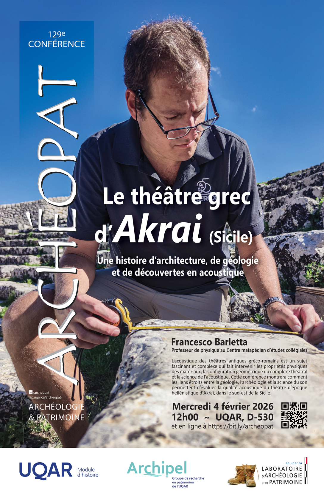 Les conférences ArchéoPatLe LAP coordonne la série de conférences et d'activités ArchéoPat en archéologie et en patrimoine, offertes en collaboration avec le groupe de recherche Archipel et les modules d'histoire et de géographie de l'UQAR. Ces activités sont ouvertes à tous gratuitement en présentiel (dans la limite des places disponibles) et en ligne.